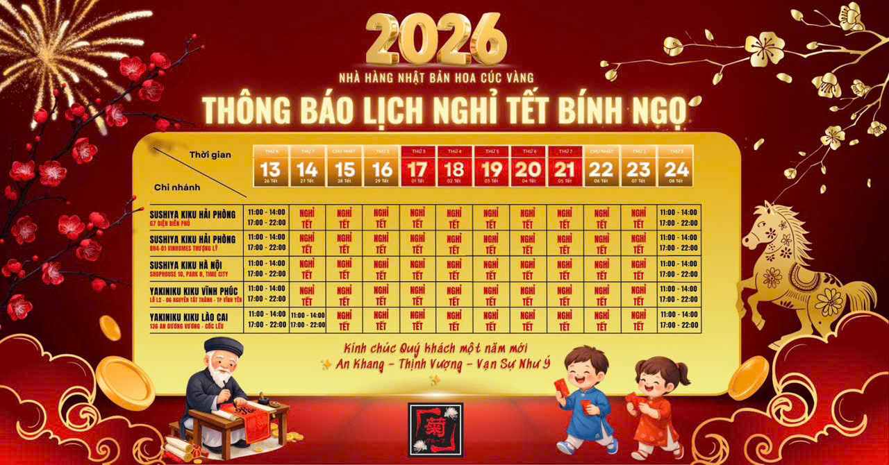 and wish you a New Year filled with peace, health, and prosperity.Cơ sở :1.Sushiya KIKU .Shop 10 park 8,Times City. Hà Nội